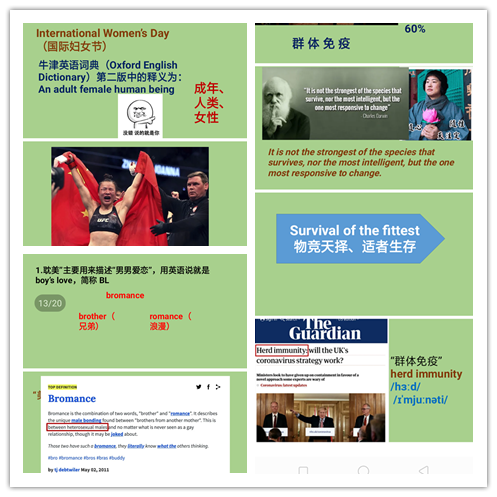 2020年注定是不平凡的一年。教研室教师兰金萍因势利导,以当前时事热点为主题进行互动学习,课下作业既有课堂知识点总结,也有环球慢速英语跟读,使学生在学习英语的同时,提高认识,明辨是非,增强社会责任感。考虑到学生词汇量较为贫乏,兰老师还利用可可英语app建立班级,随时关注学生背单词的进度和准确率。