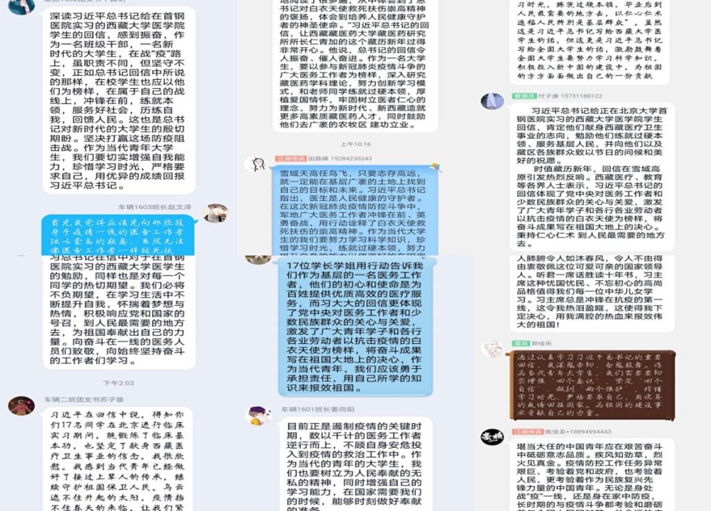 在藏历新年来临之际,抗击疫情的攻坚时刻,习近平总书记于2月21日给正在北京大学首钢医院实习的西藏大学医学院学生回信。365官网机械与动力工程学院积极响应学校学习习总书记的回信精神,充分利用视频会议及QQ平台,学院教师、辅导员和学生分别进行学习讨论,认真研读习近平总书记的回信