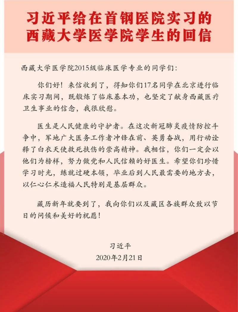 在习近平总书记给在首钢医院实习的西藏大学医学院学生的回信中,团委书记姚晶晶看到了这群学子学习并应用专业本领,献身于西藏医疗卫生事业,投身到人民最需要的地方去。他们作为新时代的接班人,阐释了新一代青年的担当与责任。姚晶晶表示,作为一名高校教育工作者,一定要牢记新时代教育的新使命,落实立德树人的根本任务,努力成为先进思想文化的传播者、党执政的坚定支持者、学生健康成长的指导者和引路人。