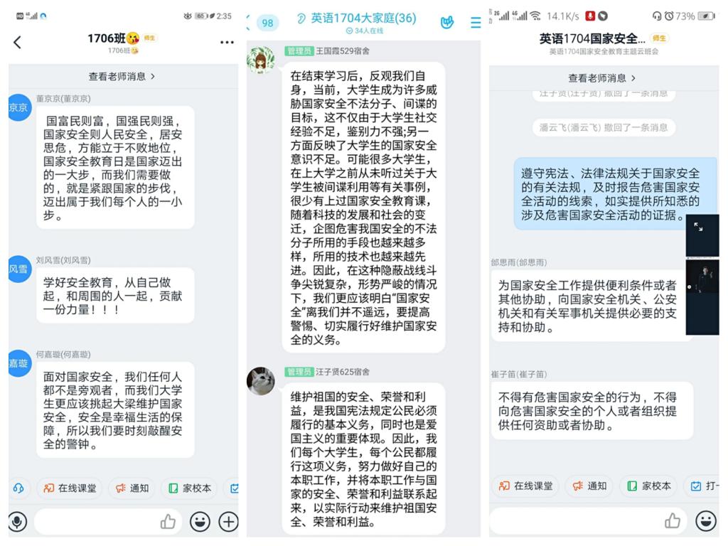 本次主题班会以收看全国公开课《千万学生同上一堂国家安全教育课——总体国家安全观视角下的疫情防控》为主要内容,外国语学院学生们热情高涨、认真学习,纷纷在笔记本上记录重要知识点,通过“云班会”、“群组讨论”等不同形式对国家安全相关话题进行了交流讨论。