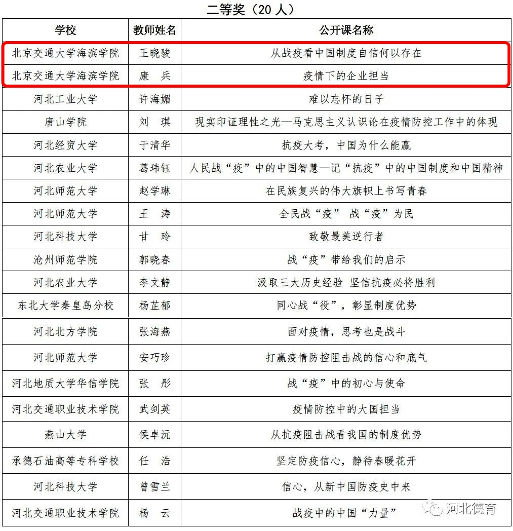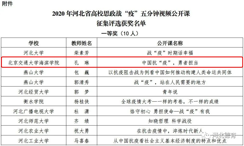 为学习贯彻习近平总书记关于新冠肺炎疫情防控工作的系列重要讲话精神,按照教育部社科司印发的《新冠肺炎疫情防控期间高校思想政治理论课教学组织工作规程》要求,创新性做好当前疫情防控形势下大学生思想政治教育工作,河北省教育厅在全省高校组织开展思政战“疫”五分钟视频公开课征集评选活动。365官网高度重视,并组织思政课和辅导员教师踊跃参与、积极申报。经专家评审,365官网教师孔琳的主讲作品《中国抗“疫”,勇者担当》荣获一等奖,教师王晓骏的主讲作品《从战疫看中国制度自信何以存在》、教师康兵的主讲作品《疫情下的企业担当》荣获二等奖。