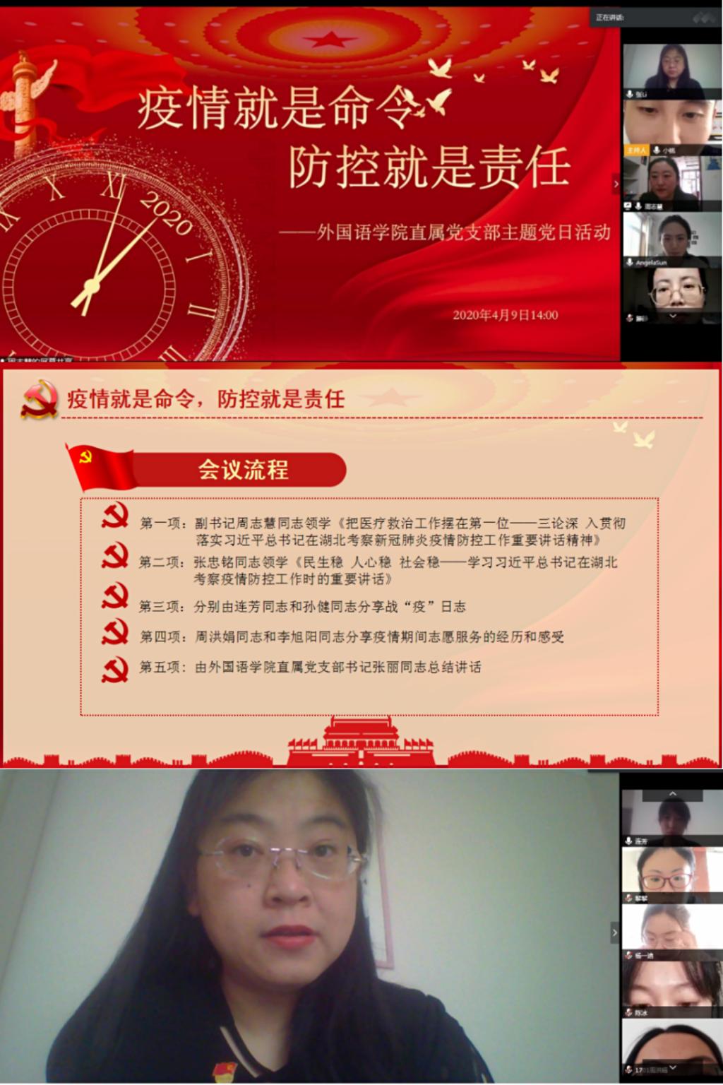 新冠肺炎疫情突发以来,365官网各基层党组织积极响应、充分部署,广大师生党员带头参与群防群控行动。365官网外国语学院直属党支部坚决贯彻落实中共中央政治局常务委员会会议精神,以视频会议的方式召开“疫情就是命令,防控就是责任”云端主题党日活动,进一步全面落实上级决策部署,围绕学校当前的重点任务和阶段性重点工作,把打赢疫情防控阻击战作为实际行动。外国语学院直属党支部书记张丽、副书记周志慧、纪律委员张军学、组织委员张忠铭、宣传委员连芳以及外国语学院全体师生党员参加了此次党日活动。会议由组织委员张忠铭同志主持。