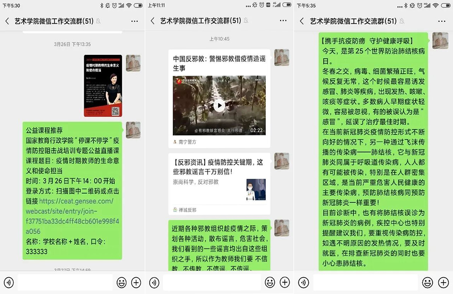 通过艺术学院微信平台和学习交流群两个载体,定期推送防控指南热点、线上观看“停课不停学”公益课程和“防疫知识要知道”等相关内容,让教师们进行日常学习防疫知识和交流。