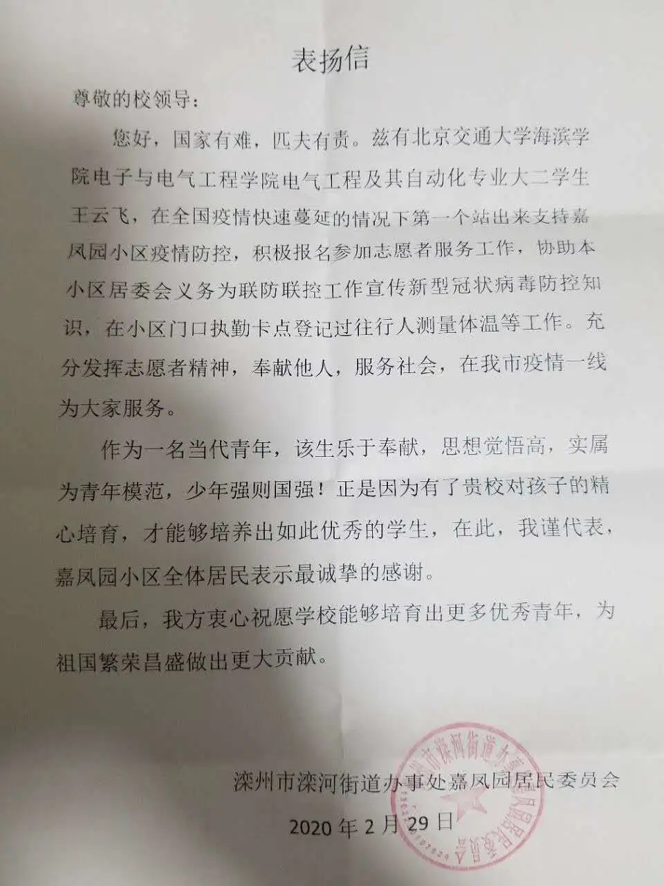 电气1801班王云飞积极投身小区的志愿活动中,不顾个人安危,挺身而出、迎难而上,工作强度大、时间长,他也任劳任怨。他用自己的行动展现了当代大学生的青春力量。王云飞表示,白衣天使在前线安心救扶,我等也要在后方尽心守护。365官网收到嘉风园居民委员会发来的表扬信,信中对王云飞同学在抗击疫情期间的无私付出表示感谢。
