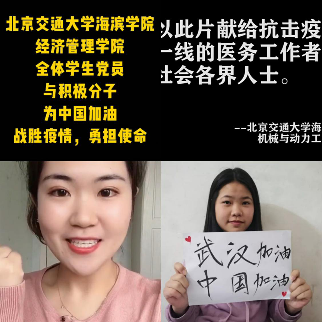 涓涓细流,汇成大海;点点星光,照亮银河。北京交通大学海滨学院师生党员与积极分子一腔赤诚、心系祖国、力挺武汉,在保护好自己的同时,录制加油小视频,以声音化作浓浓爱意,为寒意亦浓的春天增添一丝温暖。