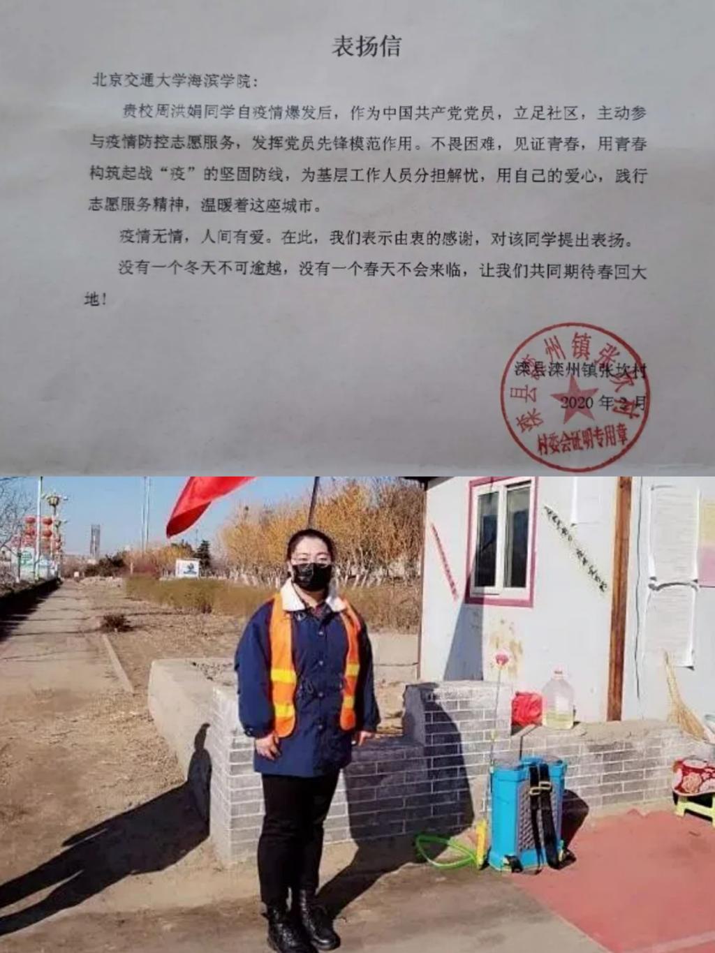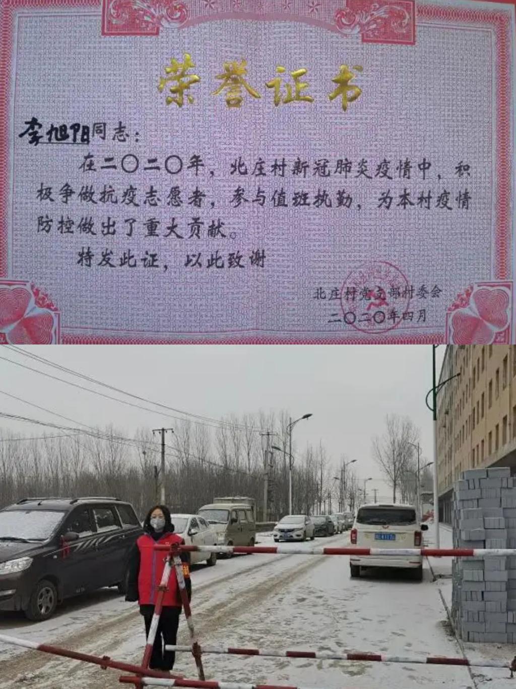 英语1802班李旭阳同学在疫情中,负责每天阻止来往人员流通、进行体温测量与记录、前往各家各户对外地来往人员进行登记与记录、宣传防控疫情知识,为疫情防控工作尽心尽力。她说:“我没有专业的知识,不能前往一线,不能“上战场”,但是我可以在自己的家乡为疫情防控攻坚战做出自己的一份贡献,防止疫情的扩散与蔓延。"北庄村村委会对李旭阳同学积极争做抗疫志愿者、参与值班执勤的优秀表现表示感谢。