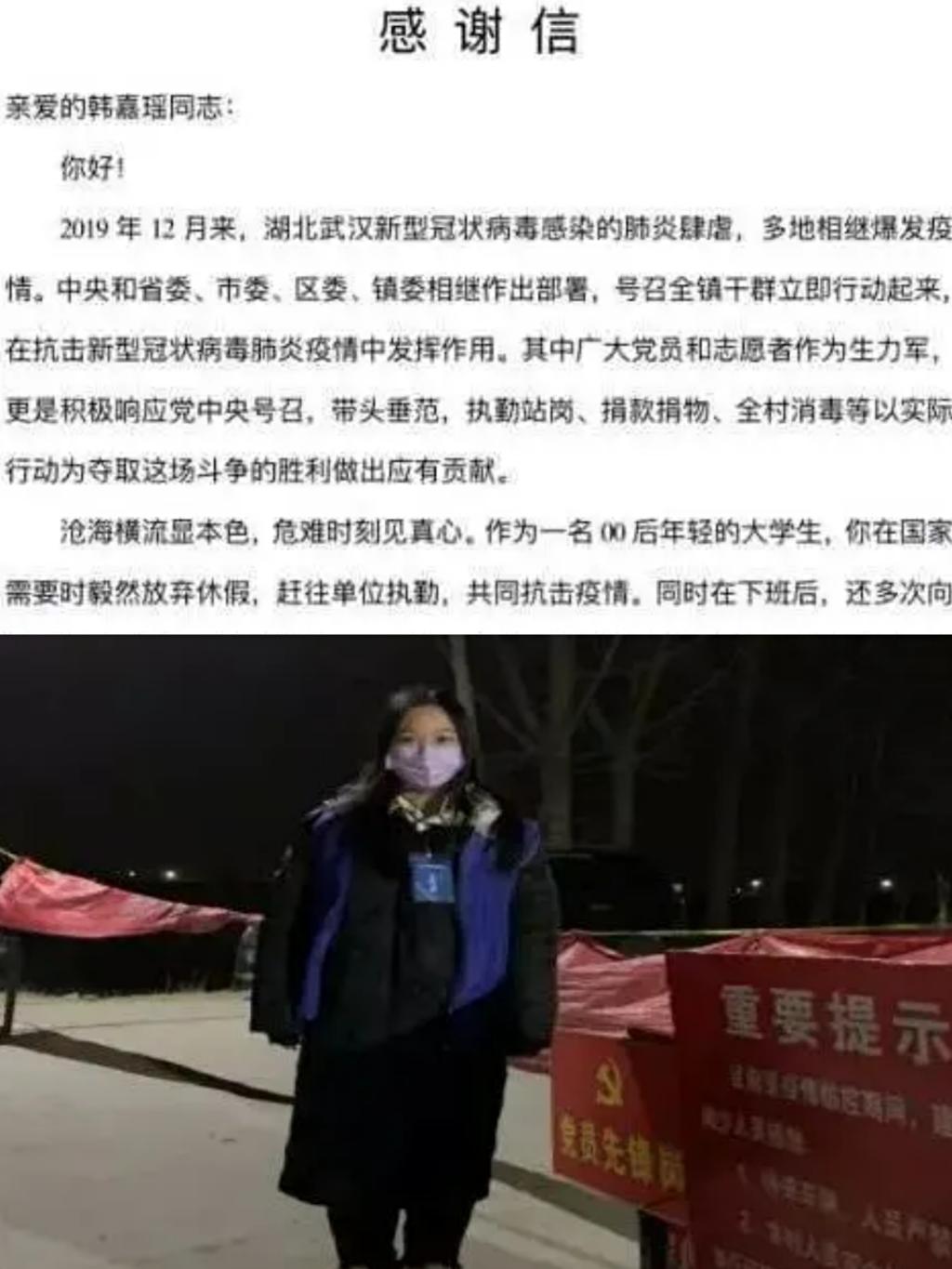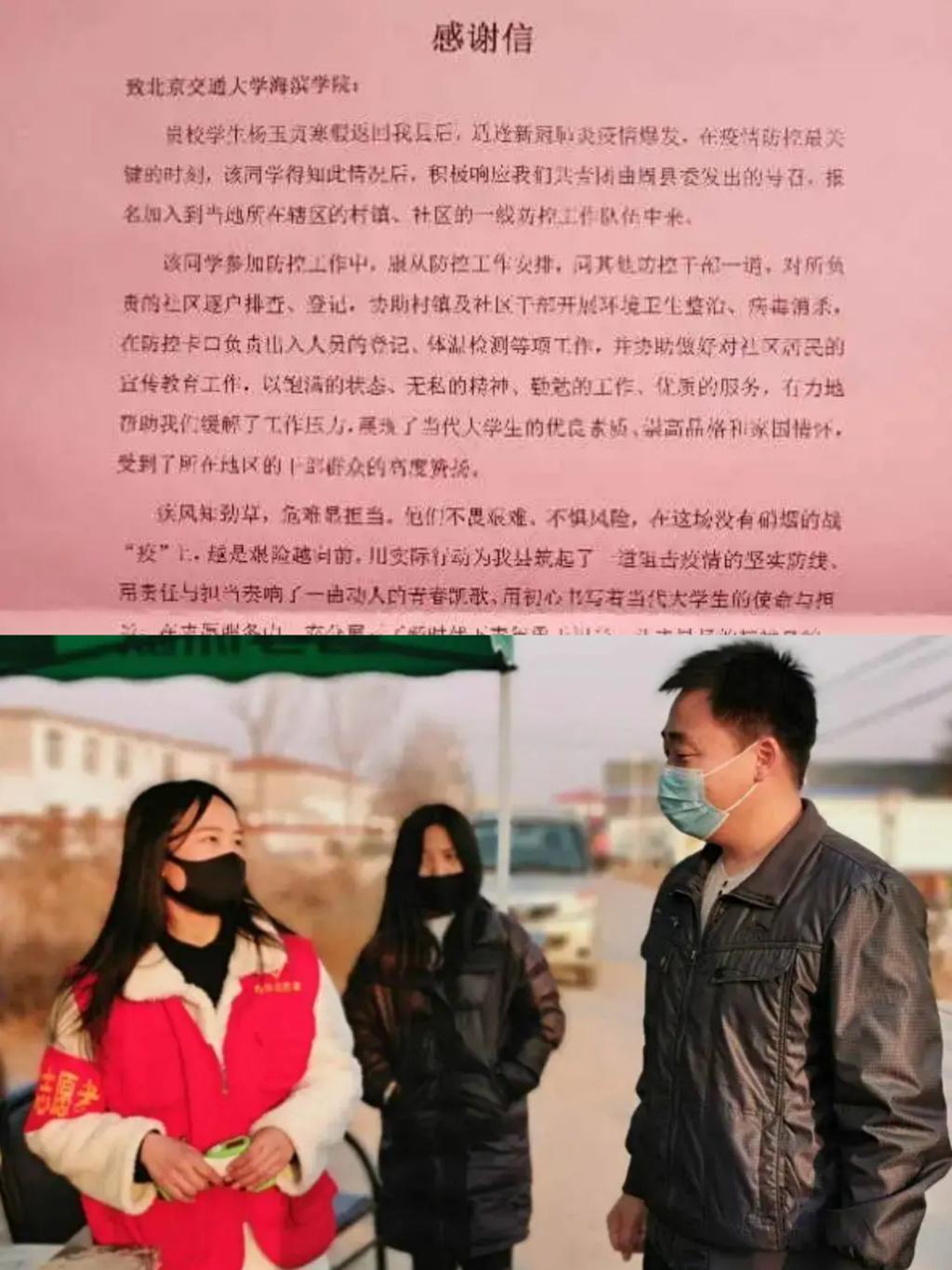 作为一名疫情防控志愿服务人员的英语1702班杨玉贞同学说:“虽然我无法像医护人员一样奔赴武汉救援第一线,但我可以在自己的家乡为打赢疫情贡献一份力量,用自己的担当筑起抗击疫情的钢铁长城。”365官网收到曲周县政府寄来的感谢信,信中对杨玉贞同学疫情防控期间积极响应政府号召、对曲周县做出的贡献表示感谢。