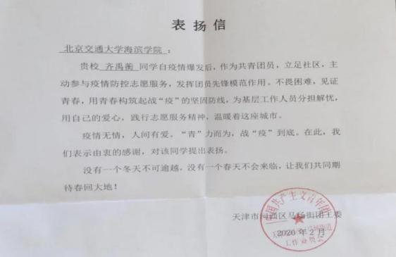 齐禹蘅同学说:“在担任志愿者的过程中,我每天在小区门口为进出居民测量体温、进行登记。在寒冷的天气中,我拿着体温枪进行测量,经常手被冻的僵硬。虽然过程很辛苦,但是我觉得能在疫情期间做一件力所能及的事非常有意义,有着满满的幸福感。”在志愿者活动结束后,当地街道办事处向齐禹蘅同学发放表扬信,感谢他在疫情期间的辛苦付出。