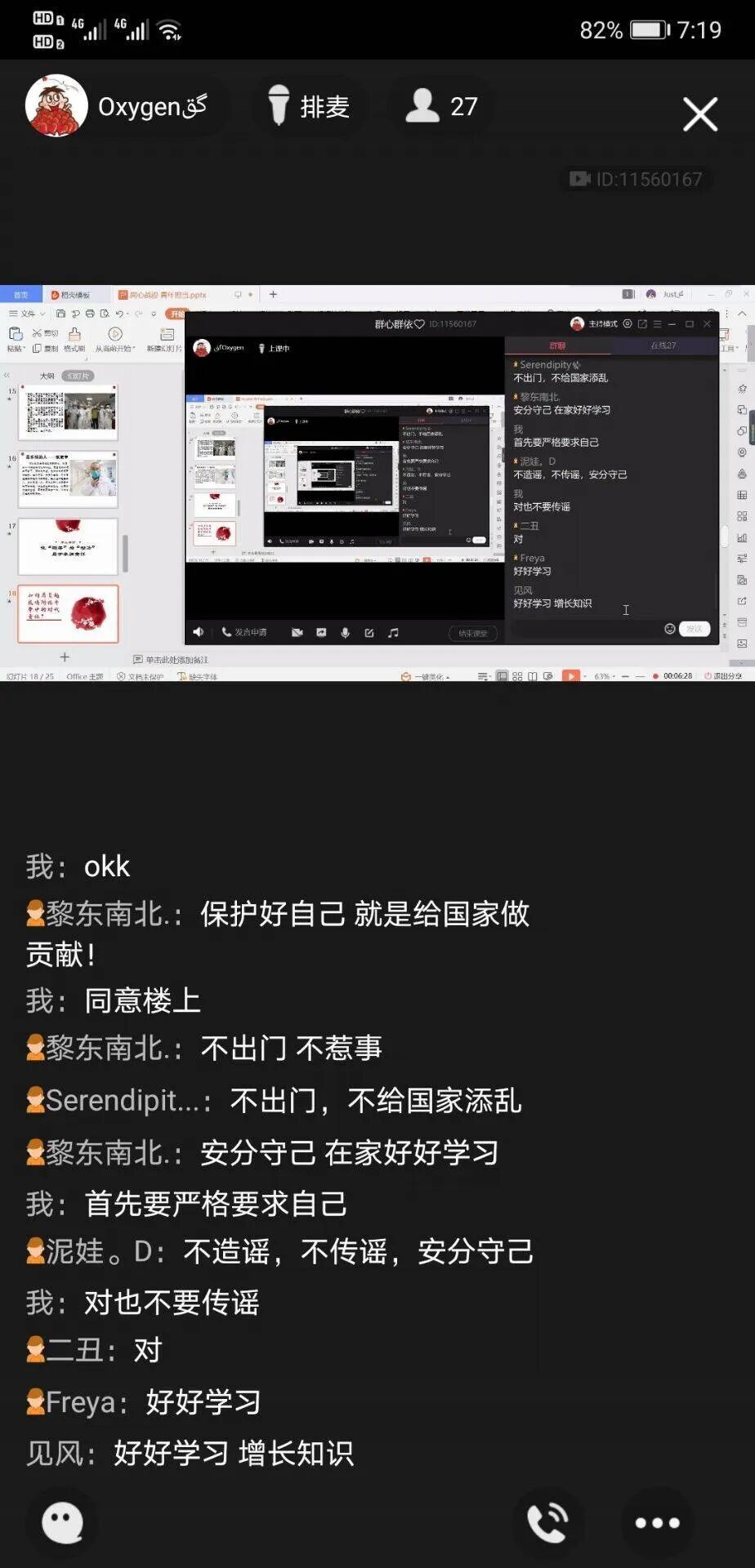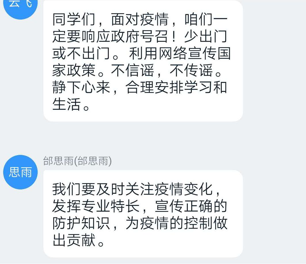 同时,英语1704班同学们针对如何防治疫情发表了自己的看法。心理委员潘云飞表示:“面对疫情,我们要响应政府号召,少出门或不出门,利用网络宣传国家政策,不信谣、不传谣,静下心来,合理安排学习和生活。”宣传委员黄婷婷讲到:“我们要听从党和政府的领导指挥,注意隔离,不去人员密集场所,保证自己的健康就是对国家的贡献。”