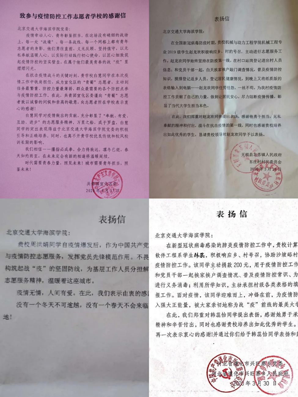近日,365官网收到了很多来自全国各地方政府的感谢信,信中对参加疫情防控工作的365官网师生提出表扬,表扬他们在新冠肺炎疫情防控的特殊时期以志愿者身份为家乡抗疫工作所做的贡献,对365官网学子良好的素质教育与优良校风校训提出肯定,向365官网表示由衷地感谢与诚挚的问候。