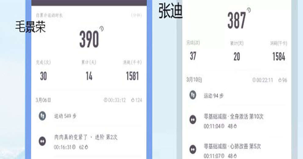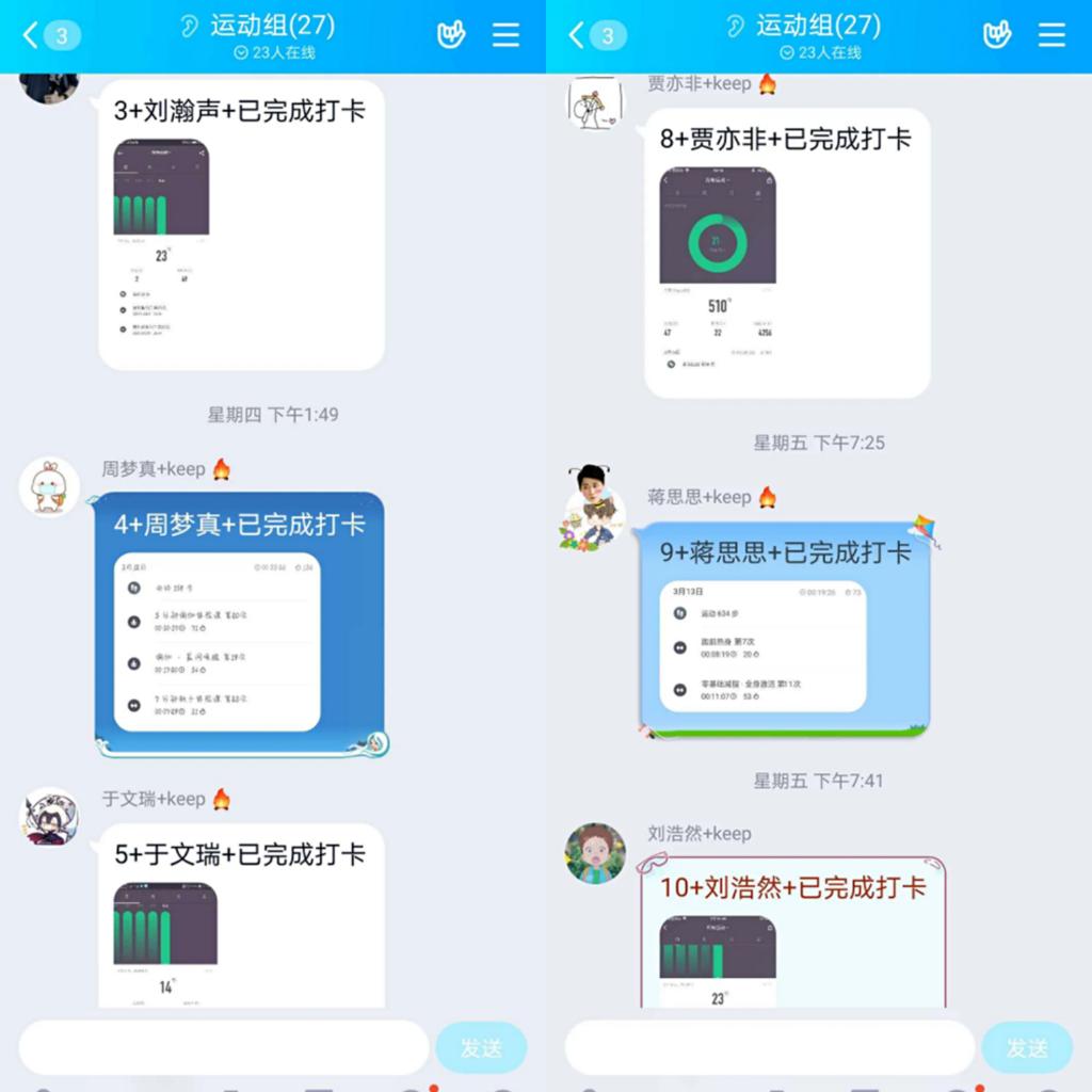 在疫情防控关键期,运动组负责监督大家锻炼身体,传播积极向上的体育精神,共抗疫情。运动组成员每天需要完成不少于半小时的体育锻炼并进行打卡,进行适当的运动增强免疫力,有益身体健康。