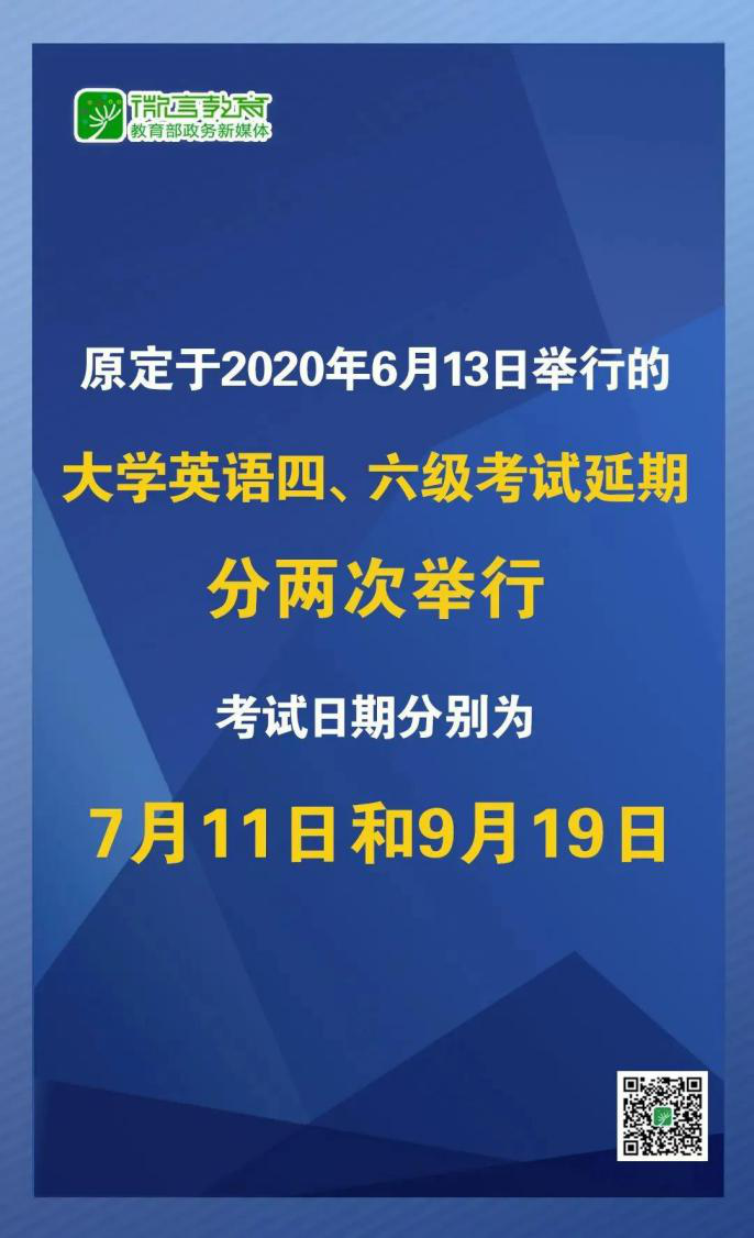 根据党中央、国务院关于新冠肺炎疫情防控工作的有关精神,经研究决定,原定于2020年6月13日举行的全国大学英语四、六级考试延期并分两次举行,考试日期分别为7月11日和9月19日。各高校可以根据复学复课实际情况及当地卫生防疫要求向省级考试机构提出考试申请,经批准后,组织一次或者两次考试。同一考生同一级别只能选择参加一次考试。具体报名时间以各省级考试机构公布为准。