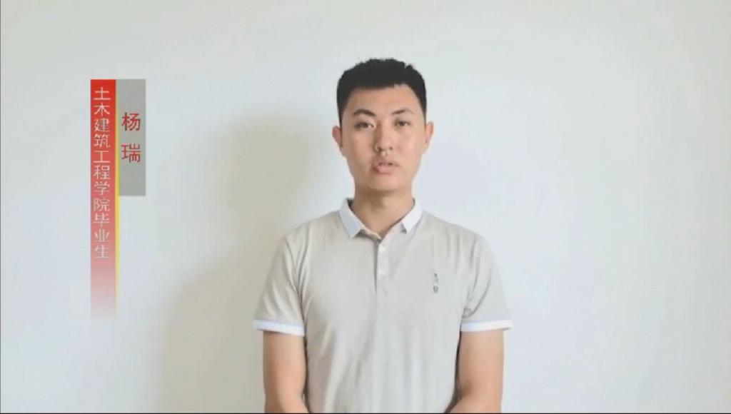 土木建筑工程学院同学杨瑞代表2020届全体毕业生表达对老师的感谢以及对母校的不舍,回首大学四年生活,衷心祝愿母校欣欣向荣、蓬勃发展,祝愿全体老师硕果累累、桃李满天下,祝愿全体毕业生大鹏一日同风起,扶摇直上九万里,来日再见。
