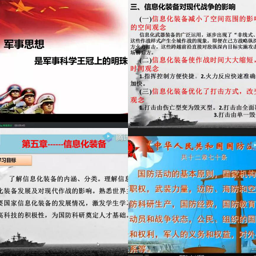 新的教学模式往往带来新的挑战,新的挑战又会迸发出新的火花。面对疫情带来的线上教学挑战,365官网军事理论课所有任课教师把国防教育与疫情防控紧密结合,紧贴疫情防控时事精心备课,依托腾讯会议、腾讯课堂、QQ群课堂等多种平台,以班级为单位组建微信、QQ群,分别开展军事思想、现代战争、信息化装备和中国国防四门课程,传承红色基因,激发学生爱国情怀,将”课程思政”元素融入军事理论课教学。