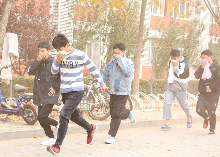 校长助理吴立军宣布演习正式开始。整个过程井然有序地进行,其中包括各指定地点开始点燃烟雾弹,发现并确认火情,拉响警报,宿舍管理员及时开启疏散通道,消防员用干粉灭火器迅速开始灭火,各个楼层学生在负责人的指引下,用湿毛巾捂住口鼻、俯身前行,迅速并整齐地逃离,最终都在安全地带集合完毕。