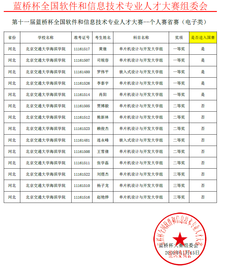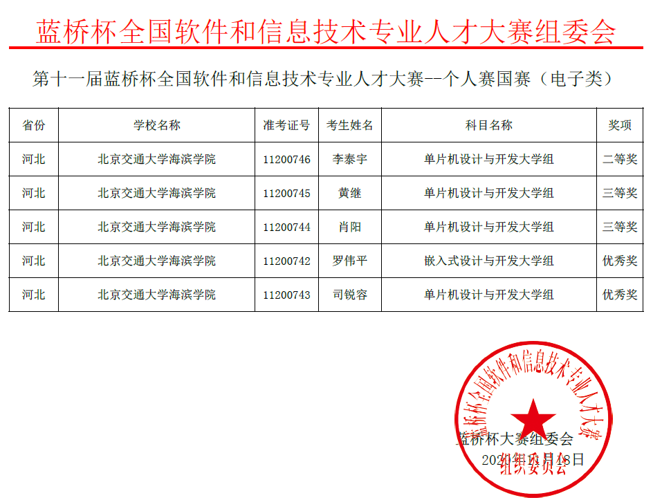 近日,第十一届蓝桥杯全国软件和信息技术专业人才大赛全国总决赛落下帷幕。365官网6名同学分别参加软件类和电子类的全国总决赛,通过与北京大学、清华大学等800余所高校的激烈角逐,最终,在单片机设计与开发大学组、C/C++程序设计大学B组、嵌入式设计与开发大学组3个项目中荣获全国二等奖2项、全国三等奖2项、全国优秀奖2项。