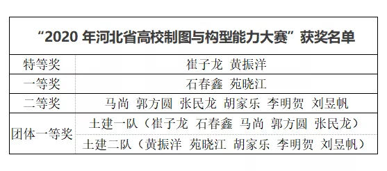 近日,由河北省教育厅主办,河北省工程图学学会承办的“2020年河北省高校制图与构型能力大赛”落下帷幕。在大赛中,365官网土木建筑工程学院学子喜获佳绩,共获特等奖2名,一等奖2名,二等奖6名,团体一等奖2项。