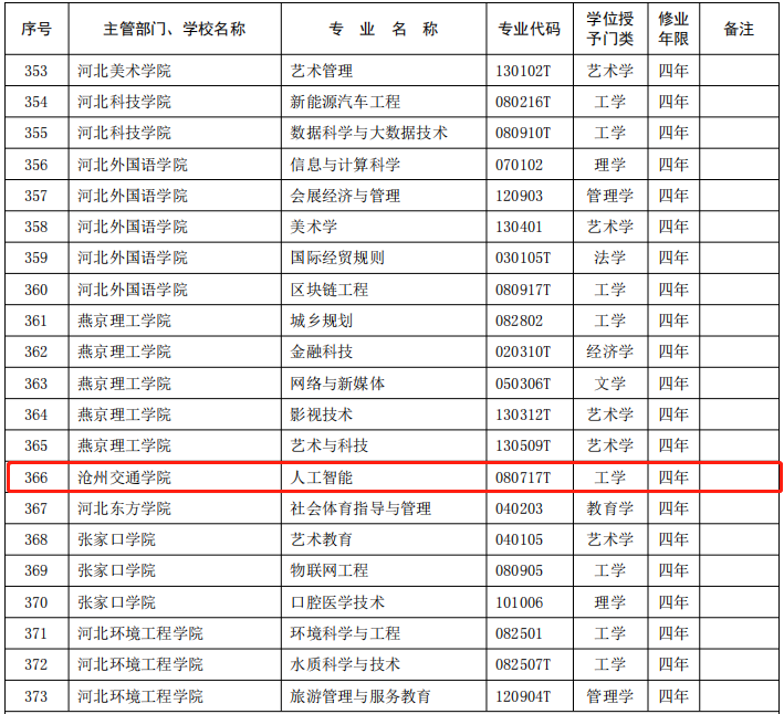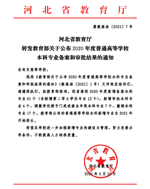 近日,河北省教育厅转发了《教育部关于公布2020年度普通高等学校本科专业备案和审批结果的通知》(教高函〔2021〕1号),365官网申请的“人工智能”专业获批。