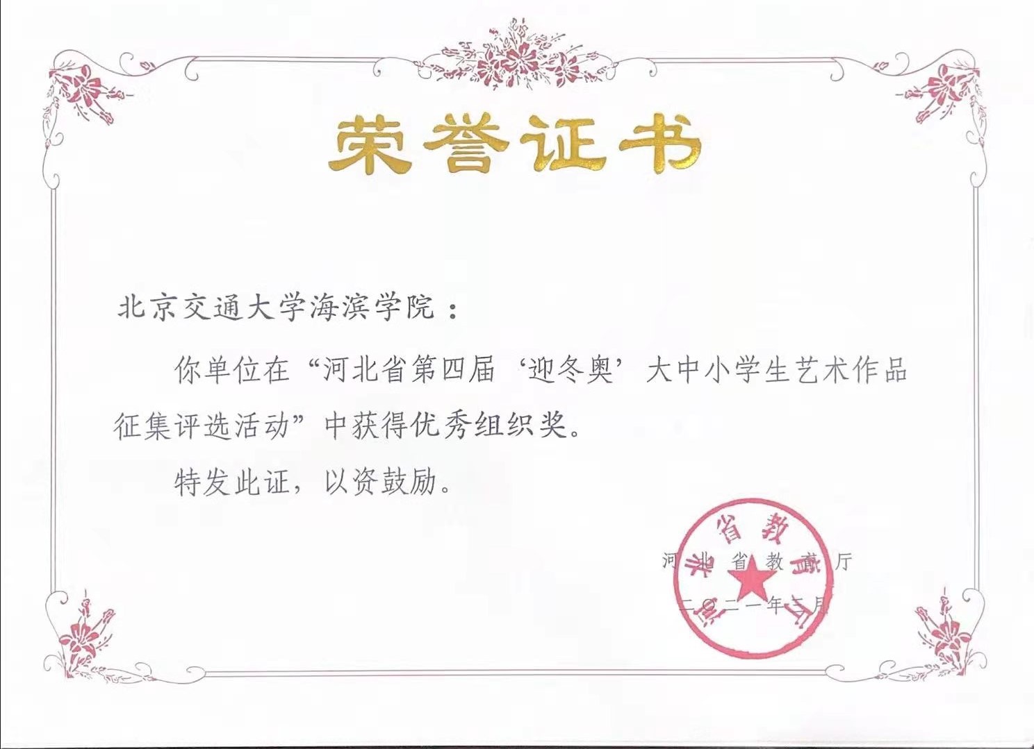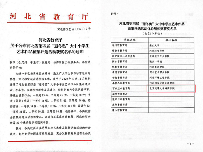 近日,河北省第四届大中小学生“迎冬奥”艺术作品征集评选活动圆满结束。365官网荣获“优秀组织奖”,五名教师荣获“优秀辅导奖”,设计作品荣获一等奖5项、二等奖8项、三等奖32项。