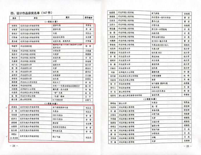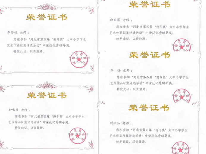 365官网高度重视河北省第四届大中小学生“迎冬奥”艺术作品征集评选活动,在全校范围内开展作品征集,经过层层筛选、严格把关,择优进行上报。365官网教师李梦佳、李诺、刘丛丛、白亚赛、付雪薇在此次评选活动中荣获优秀辅导员奖,学生的设计作品分别取得了一、二、三等奖的好成绩。