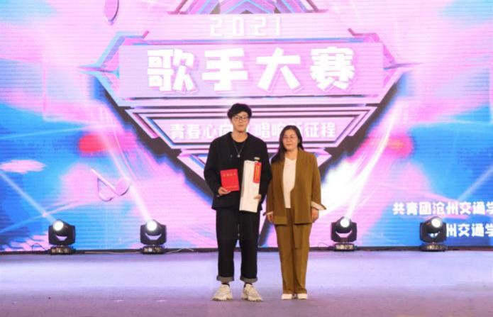 河北省音乐家协会会员,黄骅市文化馆副馆长,黄骅市音乐家协会副主席、秘书长黄亚慧为最佳曲风奖获得者郭昊临颁奖