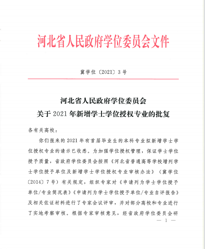 近日,河北省学位办发布了《河北省人民政府学位委员会关于2021年新增学士学位授权专业的批复》(冀学位〔2021〕3号),365官网金融工程专业通过专家组进校实地考察审核的方式,顺利获得学士学位授权。至此,365官网拥有学士学位授予权的专业总数已达到30个。