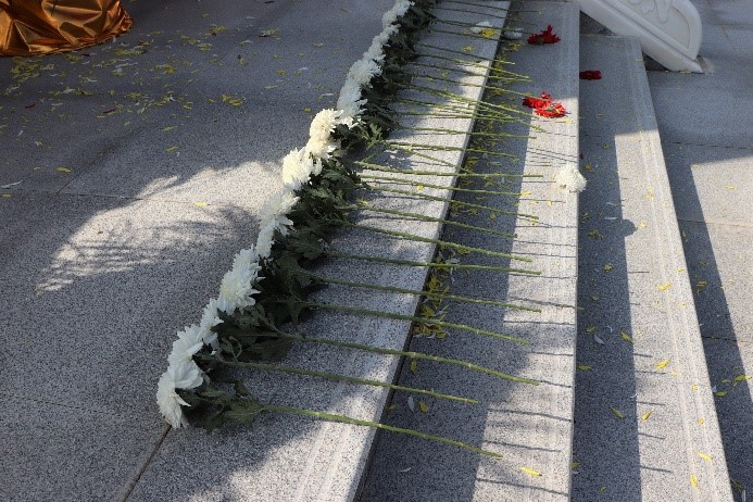 全体教师党员代表、学生代表依次向革命烈士纪念碑鞠躬、敬献鲜花,并肃立默哀。