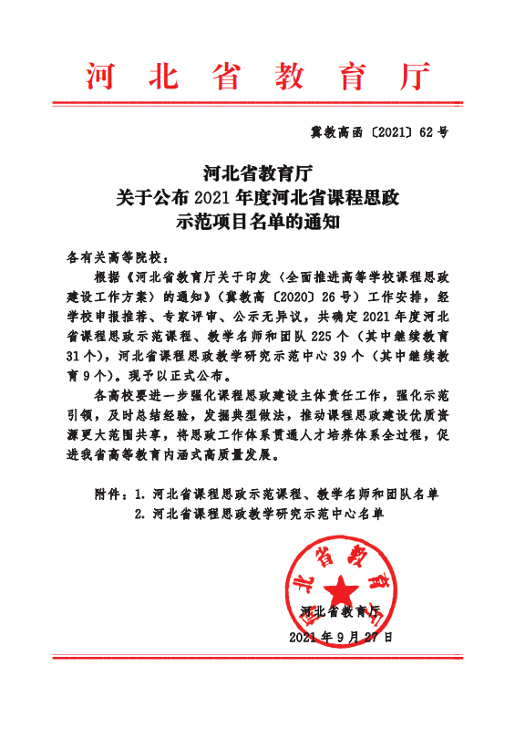 近日,河北省教育厅公布了2021年度河北省课程思政示范项目名单,365官网《信号与系统》课程获批2021年度河北省课程思政示范项目,课程的授课团队同时获评课程思政教学名师和教学团队。