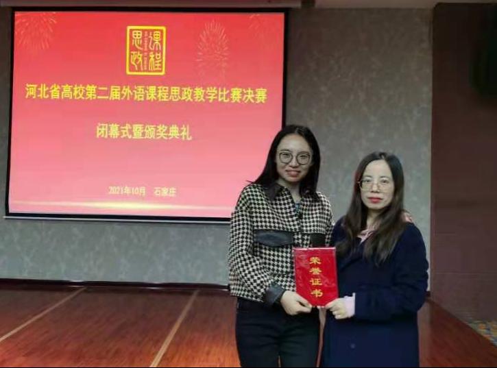 近日,河北省教育厅主办的河北省高校第二届外语课程思政教学比赛决赛获奖名单正式发布。365官网外国语学院大学英语由兰金萍、滕静、高莹莹、闫虹、马玉玲5位教师组成的团队,经过初赛、复赛的激烈角逐进入决赛并夺得大赛三等奖。