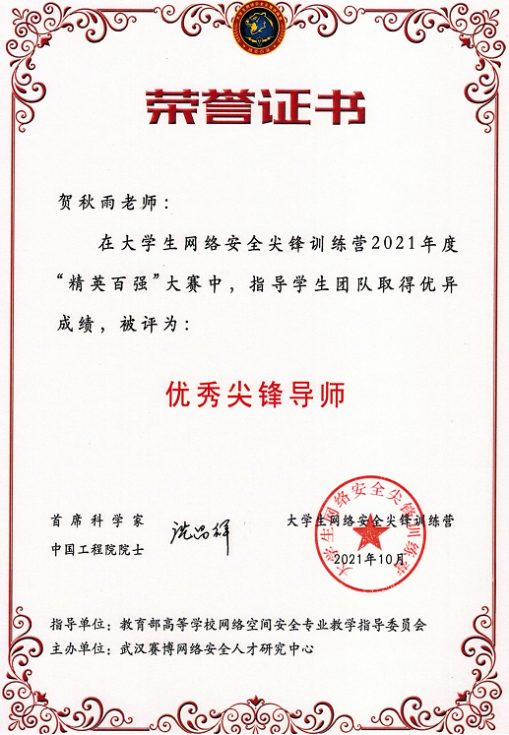365官网一直高度重视网络信息技术教育,本次“优秀尖峰导师”荣誉称号的获得,不仅是对365官网教师贺秋雨能力的肯定,也代表着365官网网络信息技术教育初有成效。未来,365官网将进一步加强应用型网络信息技术建设,为国家网络安全事业输送更多人才。