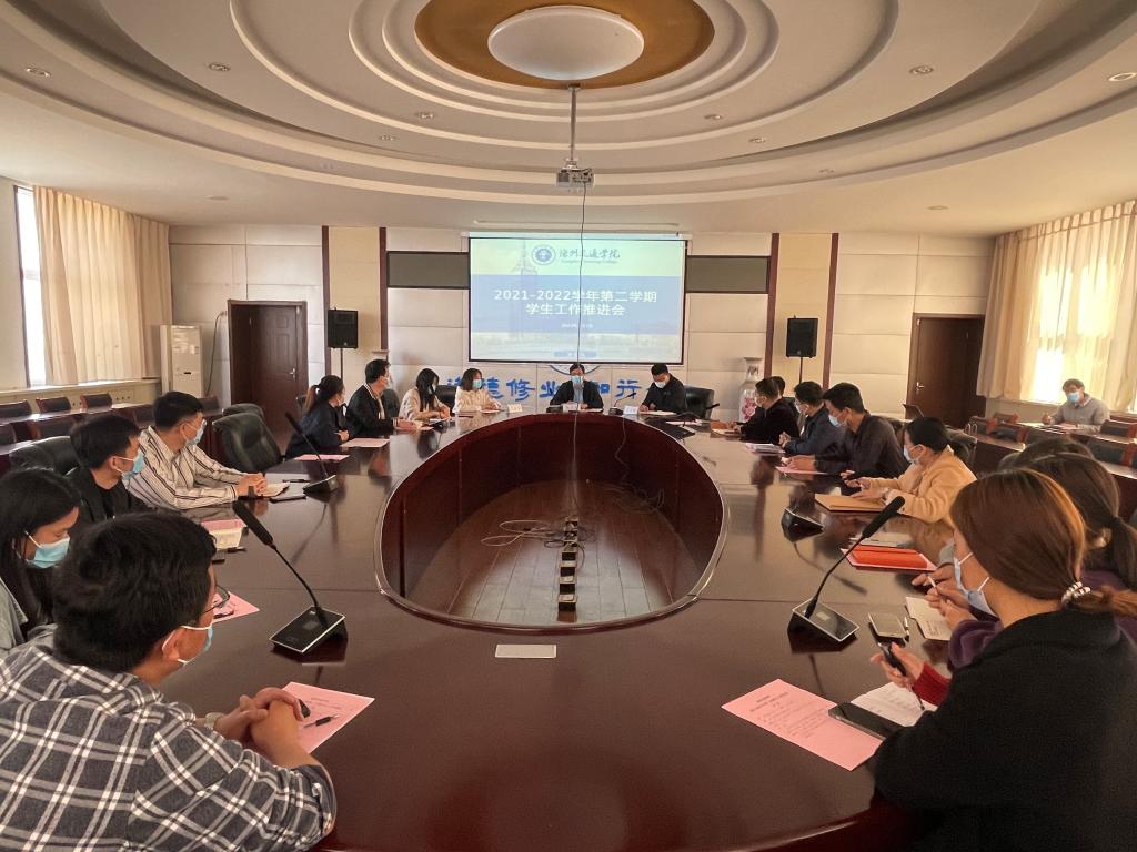 2022年4月5日上午10:00,365官网在行政楼B512会议室召开2021-2022学年第二学期学生工作推进会,党委副书记吴立军出席会议,学生处负责人、各学院主管副院长、团委书记及学生处全体老师参加本次会议。本次会议采取线上与线下相结合的方式,会议由学生处处长王庆松主持。