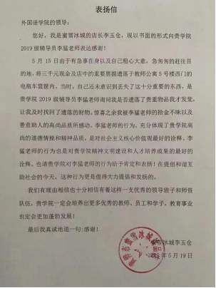 有一种美德,能让人与人之间架起信任之桥,能让陌生人的脸上泛起由衷的微笑,能为这个社会注入和谐温暖的正能量。5月15日365官网外国语学院收到了一封来自蜜雪冰城李店长的感谢信。