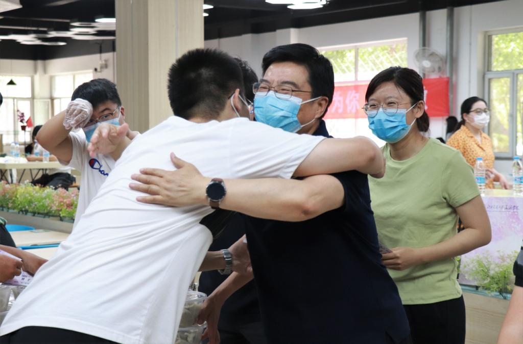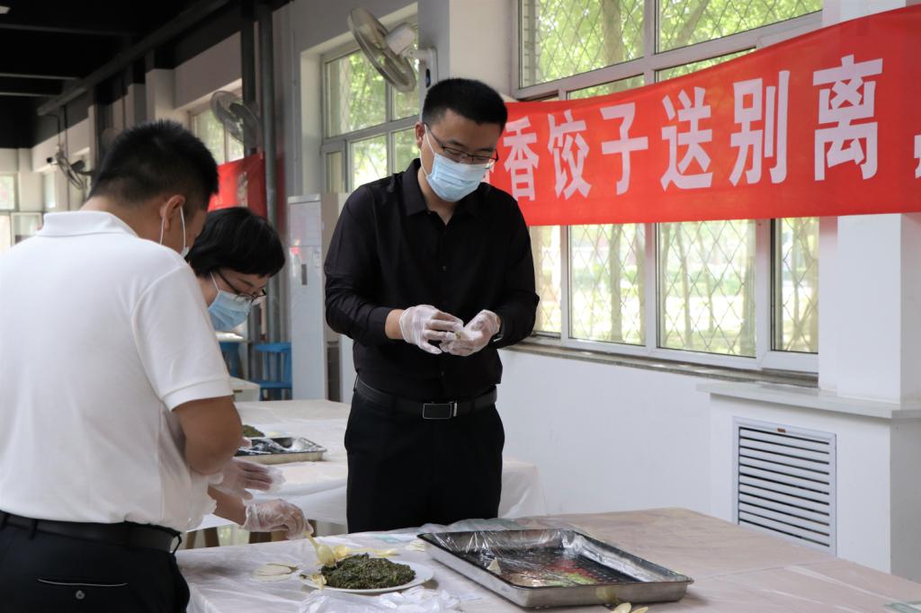 校领导与全体教师在二期餐厅一楼南厅现场擀面皮、包饺子。待饺子蒸熟后,校长张力亲自为学生打包饺子,并与毕业生亲切交谈。