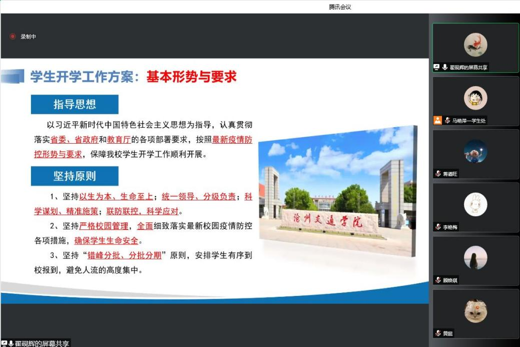 紧接,学生处副处长翟砚辉对2021年新生报到防疫工作方案进行阐述,强调2022年学生开学工作方案要遵循最新的疫情防控形势和政策要求,就开学时间安排、 学生返(到)校、其他工作安排、开学前准备工作、学生返校后管理工作、学生到校安排和具体流程、学生报到流程七个方面进行了细致的分析与介绍。