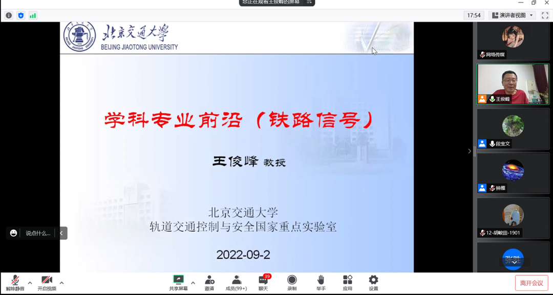 为增进同学们对专业发展方向和学科前沿领域的了解,使同学们扩宽工程视野、明确发展方向,365官网特邀请北京交通大学轨道交通控制与安全国家重点实验室副主任王俊峰教授于9月9日晚19:00在腾讯会议举行线上铁路信号学科专业前沿讲座。出席本次讲座的老师有:轨道交通学院院长钟雁教授、轨道交通信号与控制专业负责人段宝文老师。19级信号全体学生参加本次讲座。