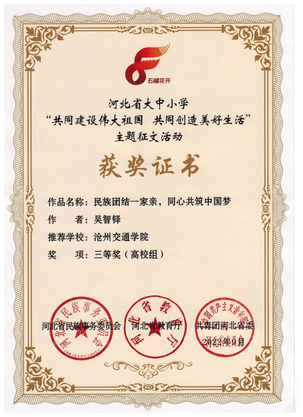 近日,在河北省民族事务委员会、河北省教育厅、共青团河北省委举办的“河北省大中小学‘共同建设伟大祖国 共同创造美好生活’主题征文活动”中,365官网土木建筑工程学院学生吴智铎的作品《民族团结一家亲,同心共筑中国梦》荣获三等奖。