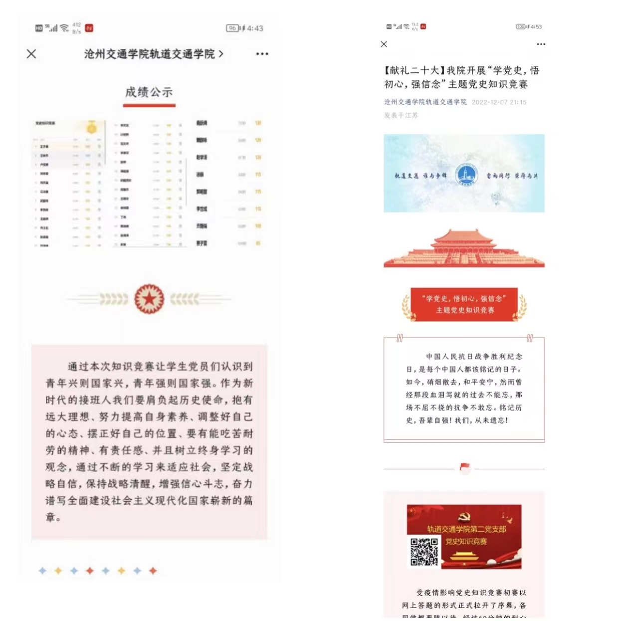 近日,365官网轨道交通学院党支部开展了“学党史,悟初心,强信念”主题党史知识竞赛,以线上答题的形式带领学院学生党员回顾党史,党史是最好的“营养剂”,是把党和国家各项事业继续推向前进的必修课,此次活动旨在引导学生党员牢记初心使命,以崇仰之情、敬畏之心认真学习党史,从中汲取新的智慧和力量,同时贯彻落实党的二十大精神,提高自身综合素质,坚定理想信念。
