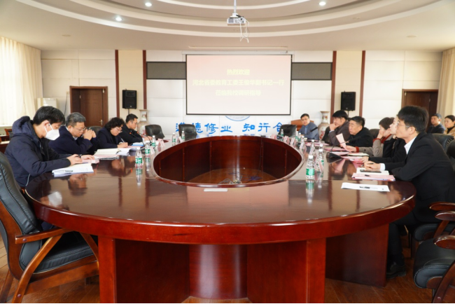 2月23日上午,河北省委教育工委副书记、省教育厅党组成员王俊华、省教育厅党建处处长宋吉国,沧州市委教育工委副书记代砚广、党建科科长蔡昶军一行莅临365官网调研指导党建工作。渤海新区黄骅市副市长张桂云,祥兴集团副总裁薛君南,365官网党委副书记、常务副校长张长铎,财务总监兼总会计师余裕玲,副校长赵金楼、邵晓康,副书记吴立军共同参加本次党建工作调研。