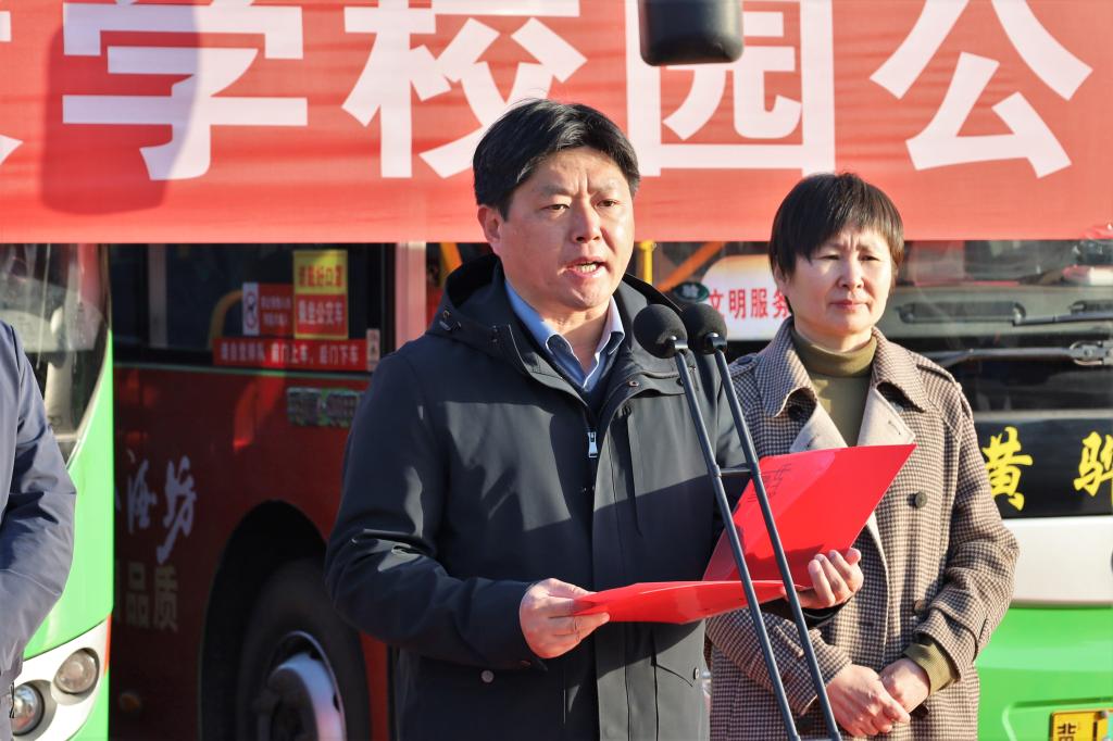 沧州渤海新区黄骅市副市长郭锋首先代表渤海新区、黄骅市政府对公交专线开通表示热烈祝贺,对长期以来关心、支持渤海新区、黄骅市公交事业发展的社会各界表示诚挚的感谢。他表示,大学校园公交专线顺利开通来之不易,其对于区域间融合发展、校企间资源共享、师生间互通交流具有重要意义。他指出,公交公司全体职工应以优质文明的服务和规范高效的管理把校园公交专线打造成展示城市形象的窗口名片,交通运输、公安交警等部门要充分发挥职能作用,共同维护良好的运营环境,同时也希望各位老师、同学们能够积极支持公交线路营运,文明乘车、平安出行。