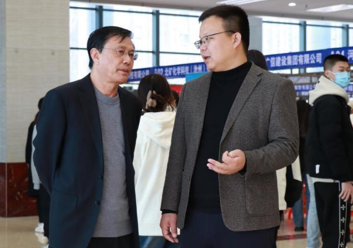 沧州市人才交流服务中心主任崔满城,黄骅市工商联党组书记张建军,渤海新区临港经济开发区人社局局长高希来,沧州渤海新区黄骅市社会事务局就业促进科科长杨为民,港城产业园区社会保障局负责人张媛媛,学校副校长邵晓康、招生就业处处长张建新与各教学单位负责人、毕业生辅导员在现场指导毕业生参加招聘。