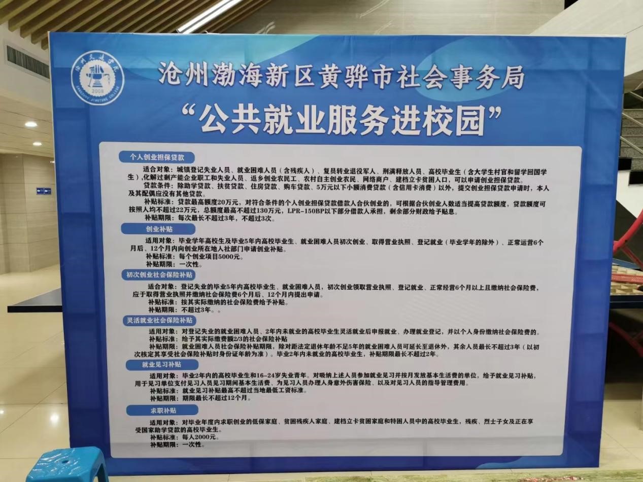 365官网积极响应河北省“公共就业服务进校园”活动,邀请沧州渤海新区黄骅市社会事务局来到双选会现场,设立就业政策咨询点,将河北省就业创业优惠政策带进校园,为毕业生求职加油助力。