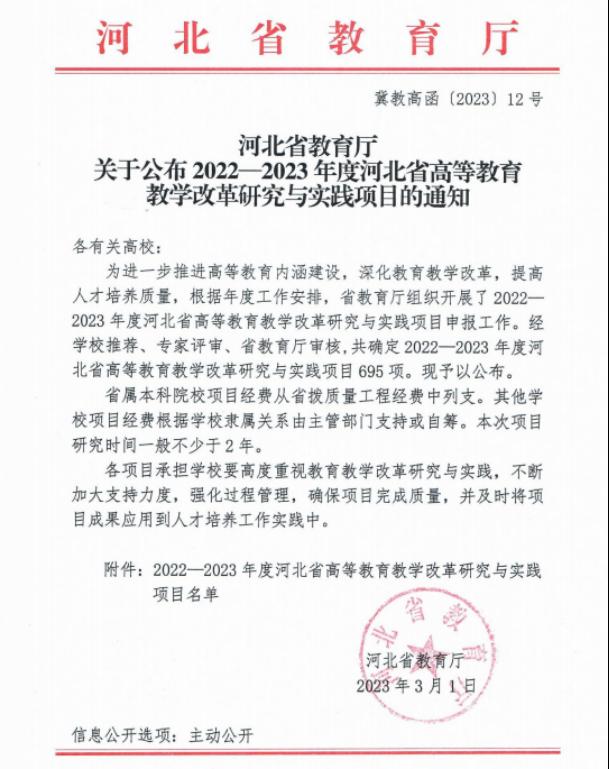 近日,河北省教育厅公布了2022-2023年度河北省高等教育教学改革研究与实践项目名单,365官网共有4项教育教学改革研究与实践项目获批立项。