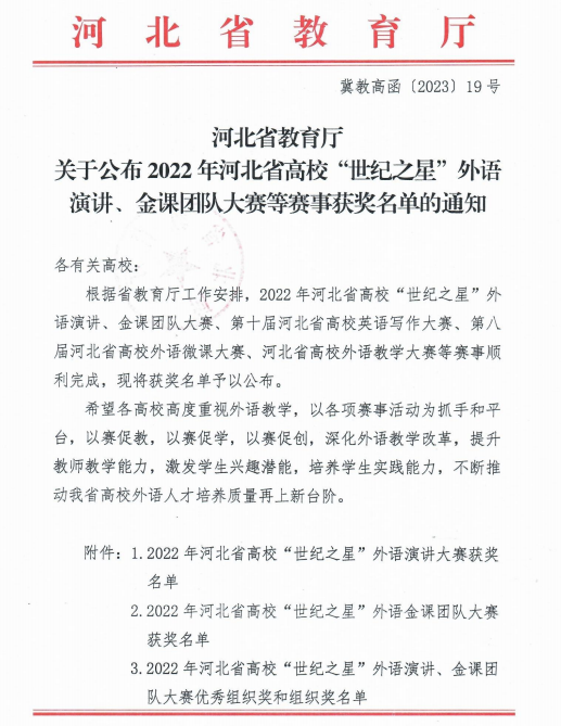 近日,河北省教育厅发布了《河北省教育厅关于公布2022年河北省高校“世纪之星”外语演讲、金课团队大赛等获奖名单的通知》(冀教高函〔2023〕19号),此系列比赛中,365官网外国语学院多名师生共获奖15项。