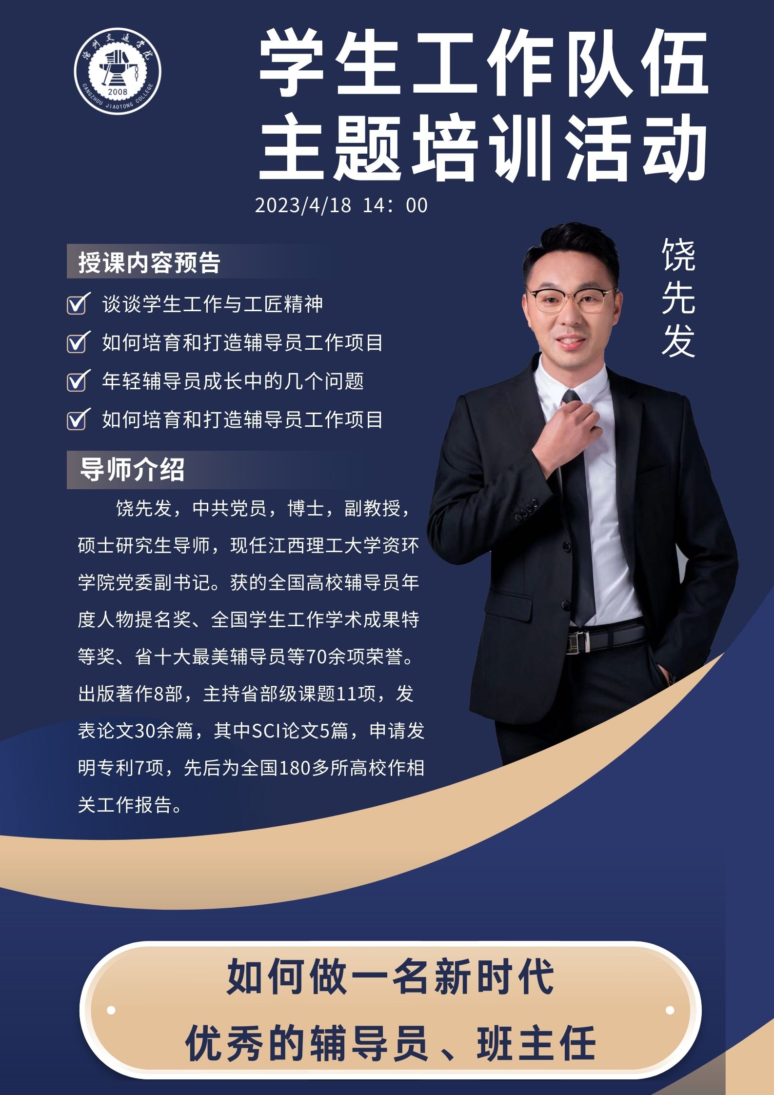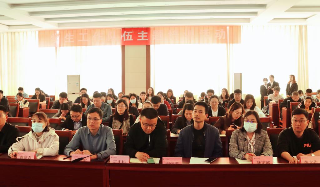 面对新的学生工作形势和特点,为进一步加强学生工作队伍建设,夯实基础工作能力,提高辅导员和班主任的业务素质和工作水平,提升职业认同感,推动365官网学生工作重基础、提质量,学生处于4月18日14:00在行政楼A512和B512会议室组织主题为“从‘一千’到‘六千万’——如何做一名新时代优秀的辅导员、班主任”学生工作队伍建设主题培训活动。本次活动邀请到了江西理工大学资环学院党委副书记饶先发教授进行授课。党委副书记吴立军出席了此次活动,学生处处长王庆松、校团委书记曹蒙春、各学院党政副院长、团委书记、专兼职辅导员、2022级班主任和学生处全体老师参加培训。学生处副处长翟砚辉主持此次培训。