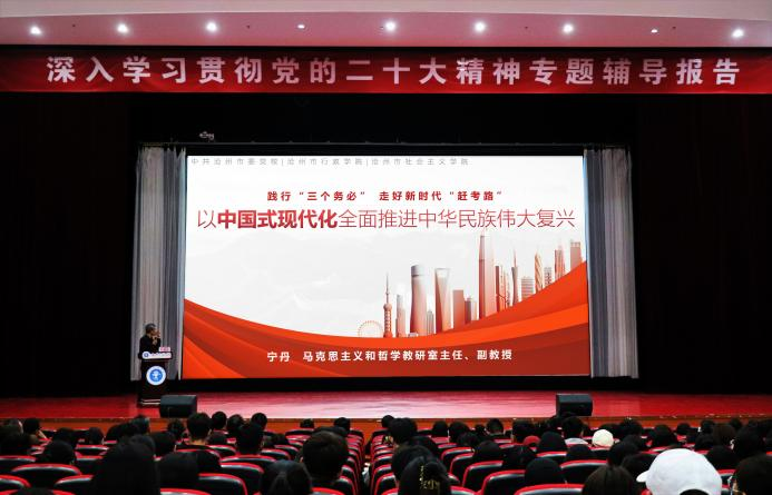 为深入学习贯彻党的二十大精神,在全校持续掀起学习宣传贯彻党的二十大精神热潮,365官网于4月26日下午2点在天佑会堂开展深入学习贯彻党的二十大精神专题辅导报告。本次报告会特别邀请了中共沧州市委党校、马克思主义和哲学教研室主任、沧州市思想政治教育特聘教授宁丹作专题讲座。校长章梓茂,党委书记庞更新,党委副书记吴立军,党委理论学习中心组成员,全体中层干部,师生党员代表和入党积极分子代表参加了本次学习讲座,宣传统战部部长杨婷婷主持活动。