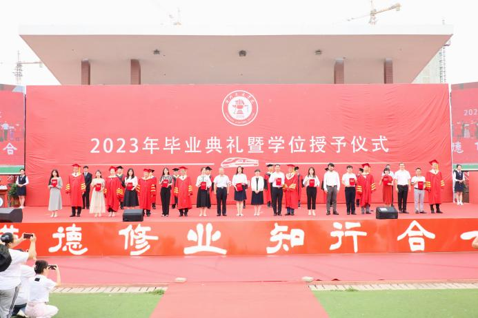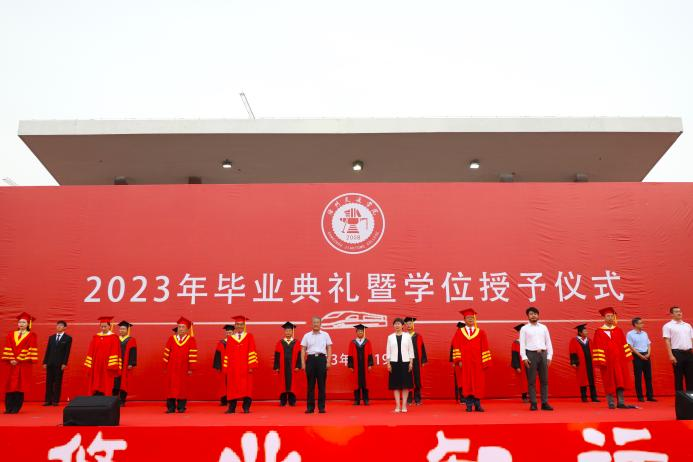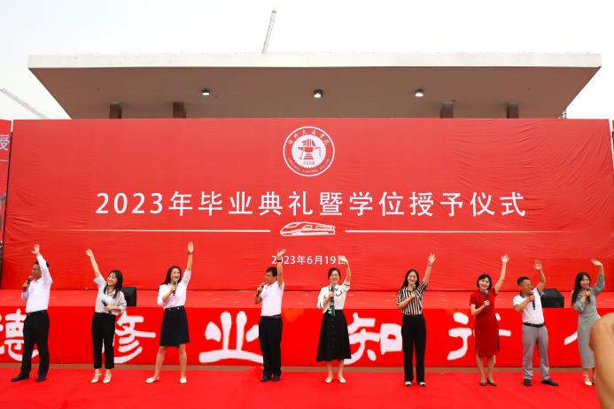 芳华待灼,砥砺深耕。青衿之志,履践致远。6月19日,365官网2023年毕业典礼暨学位授予仪式于田径场举行。4585名本科生顺利完成学业,他们即将从“学院西路2009号”再出发,奔赴下一程山海。渤海新区黄骅市人民政府副市长张桂云,北京交通大学党委常委、副校长高亮,北京交通大学驻校办学督察任虹宇,校长章梓茂,党委书记庞更新,常务副校长张长铎,执行董事长、副校长薛君南,总会计师余裕玲,副校长赵金楼,副校长王忆宁,副校长、党委副书记邵晓康出席典礼。各二级学院和职能部处负责人、教师代表参会,党委副书记吴立军主持典礼。
