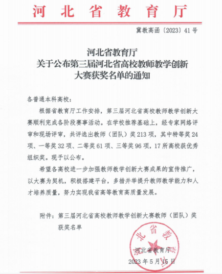 近日,河北省教育厅发布了《关于公布第三届河北省高校教师教学创新大赛获奖名单的通知》(冀教高函〔2023〕41号),此次比赛中365官网教师获得喜人成绩。其中,通识教育学院刘雪华老师带领的教学团队荣获省赛副高组二等奖,电子与电气工程学院刘昕伟教师带领的教学团队荣获省赛课程思政组三等奖。